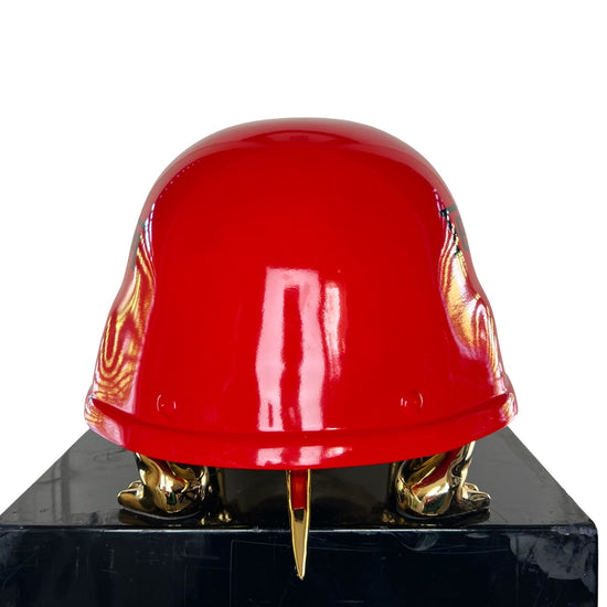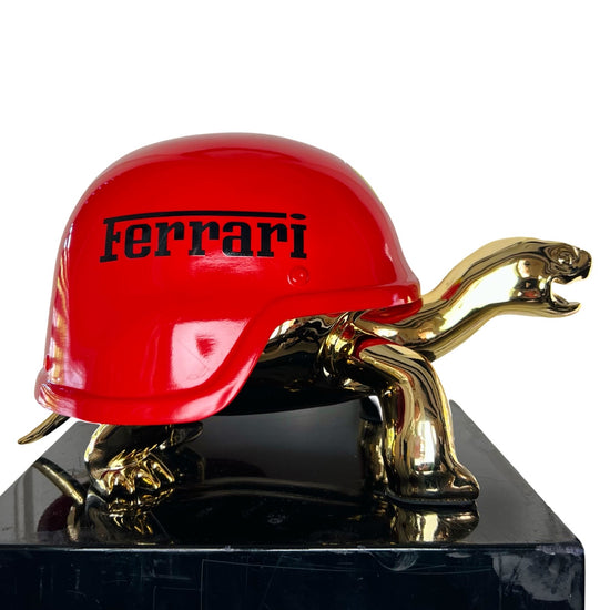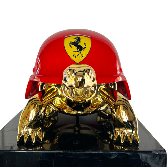 Van Apple created the Peace Turtles on his own artistic way. He gave the turtles a helmet instead of their shell, to show his love and respect for these protected species. The turtles are created in gold to express their value and are given a colorful and contemporary helmet, each design makes a statement.