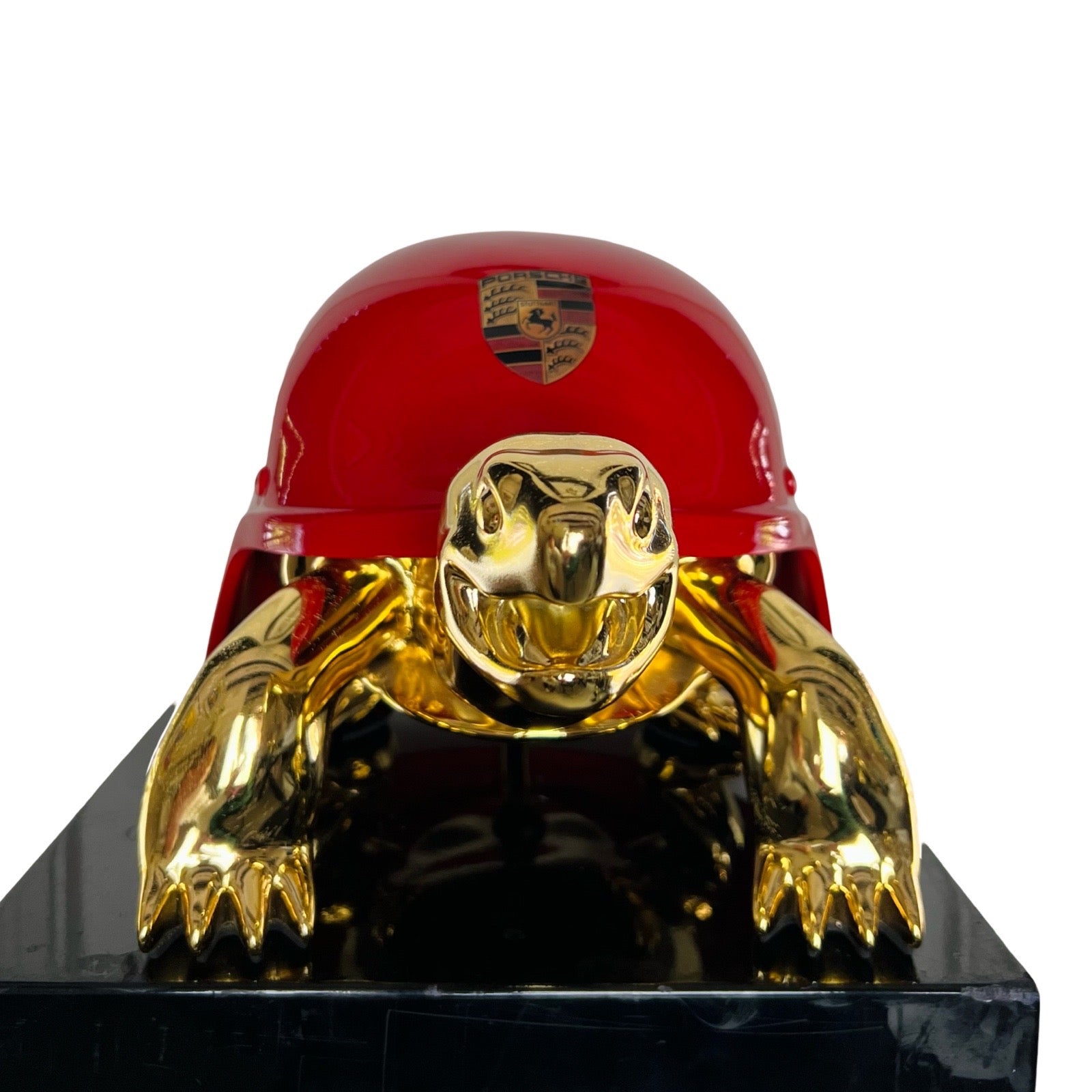 Van Apple created the Peace Turtles on his own artistic way. He gave the turtles a helmet instead of their shell, to show his love and respect for these protected species. The turtles are created in gold to express their value and are given a colorful and contemporary helmet, each design makes a statement.