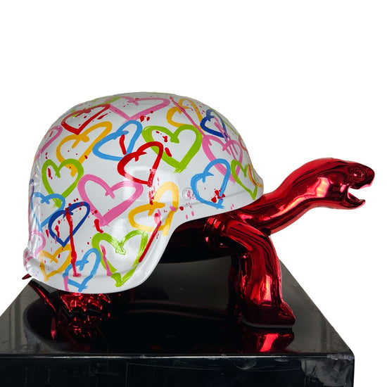 Van Apple hat die Goldenen Friedensschildkröten auf seine eigene künstlerische Art und Weise geschaffen. Er gab den Schildkröten einen Helm anstelle ihres Panzers, um seine Liebe und seinen Respekt für diese geschützten Arten zu zeigen. Die Schildkröten sind in Gold gehalten, um ihren Wert zum Ausdruck zu bringen, und erhalten einen farbenfrohen und modernen Helm. Jedes Design setzt ein Statement.