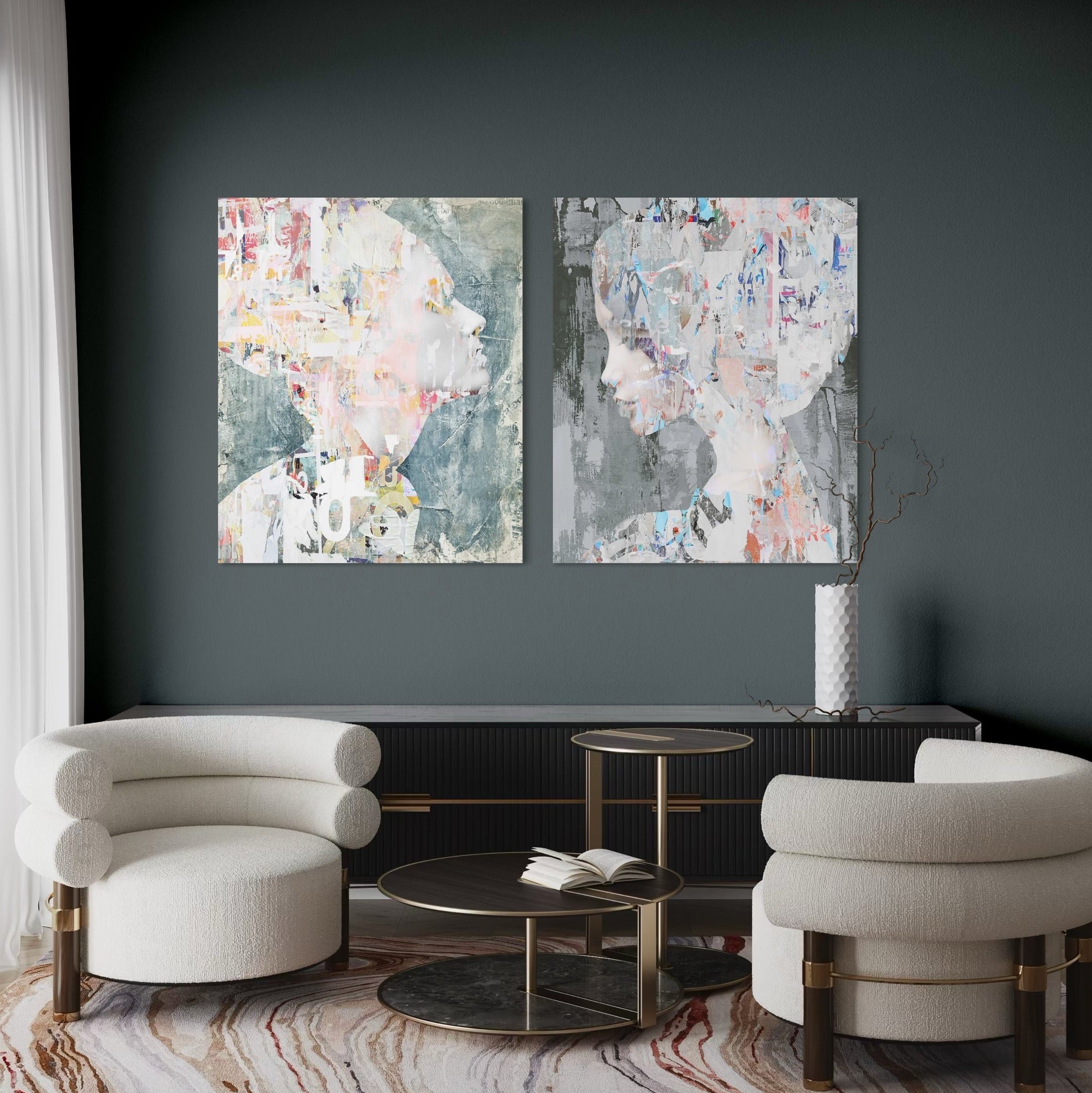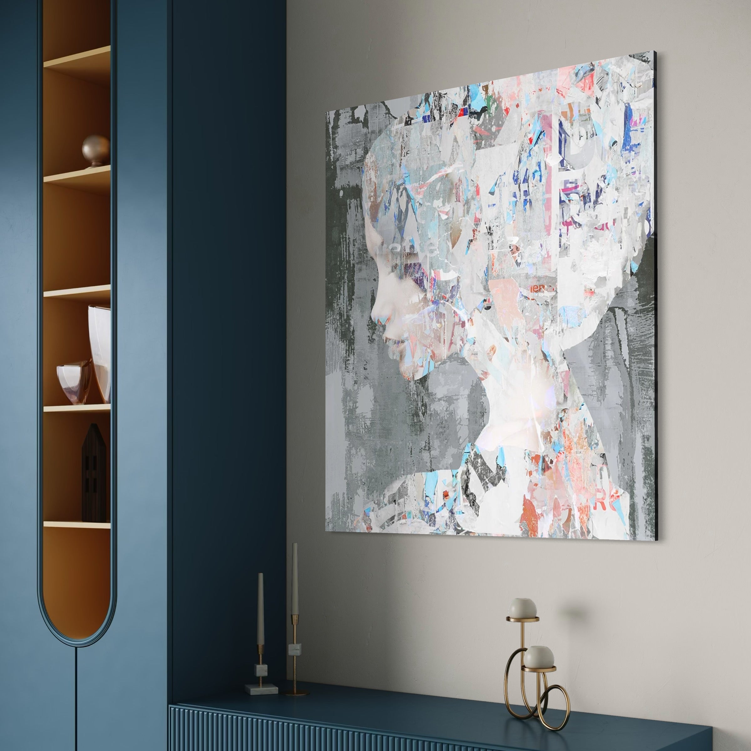 His signature series Faces are printed and edited on leather. The artwork is set on an aluminum dibond plate and provided with a sleek aluminum frame.
