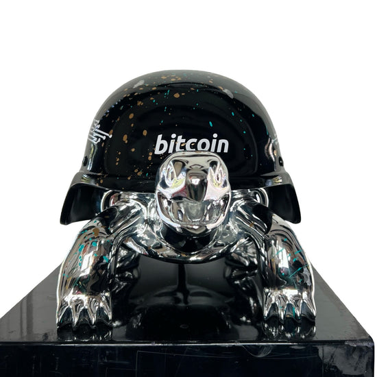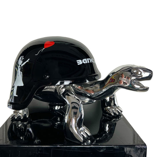 Van Apple created the Peace Turtles on his own artistic way. He gave the turtles a helmet instead of their shell, to show his love and respect for these protected species. The turtles are created in gold to express their value and are given a colorful and contemporary helmet, each design makes a statement.