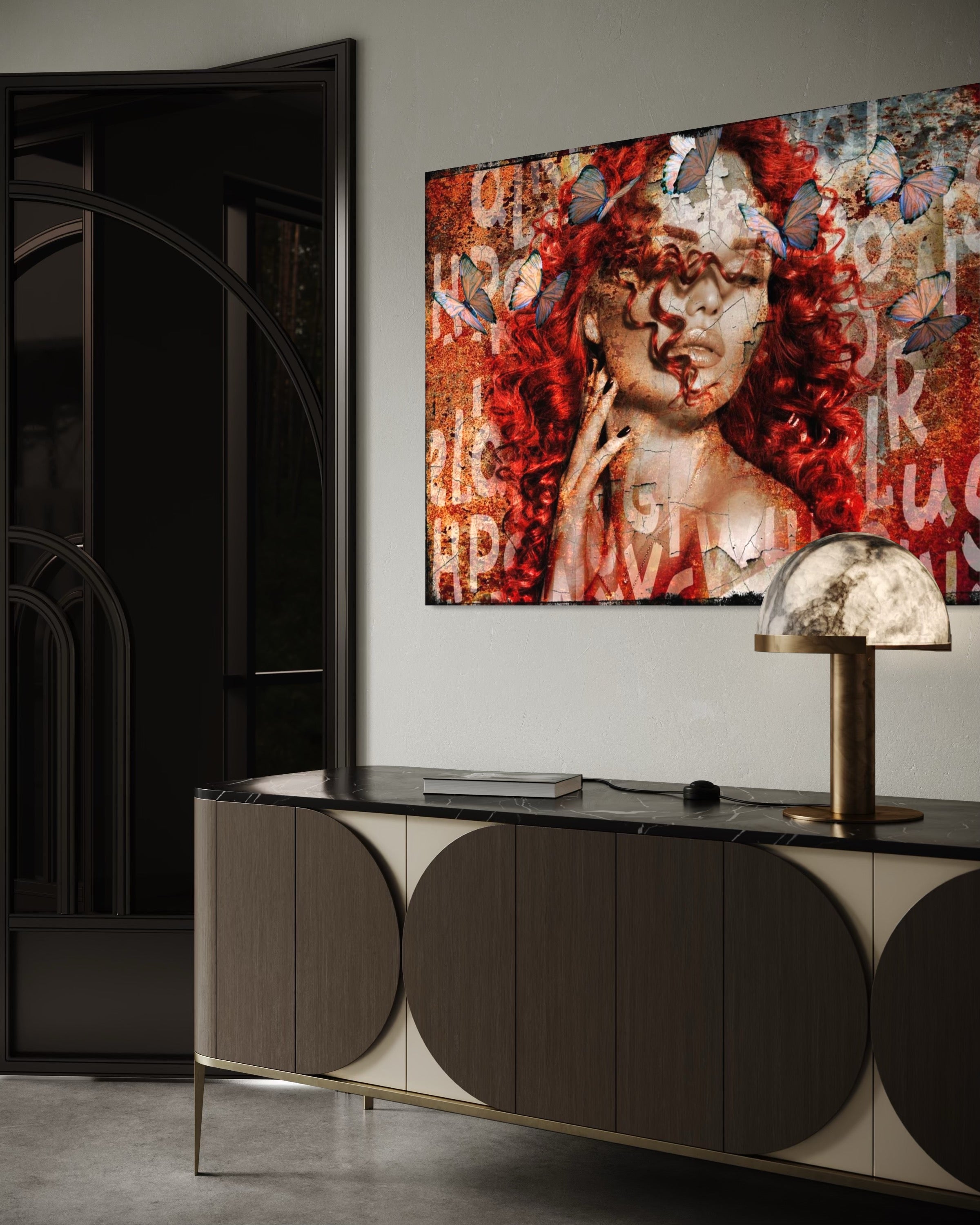 His signature series Faces are printed and edited on leather. The artwork is mounted on an aluminum dibond plate and provided with a sleek aluminum frame.