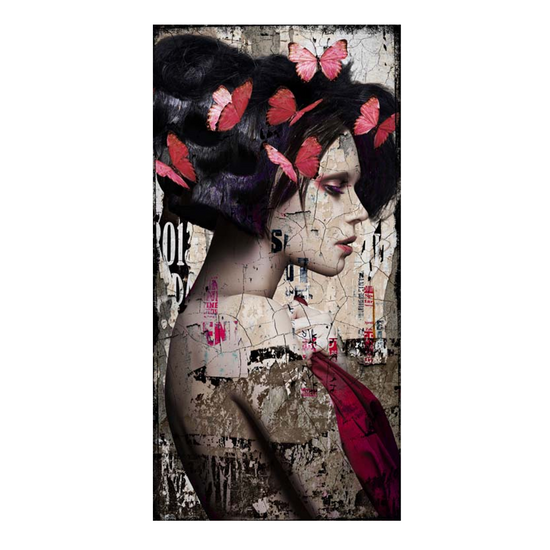 His signature series Faces are printed and edited on leather. The artwork is mounted on an aluminum dibond plate and provided with a sleek aluminum frame.