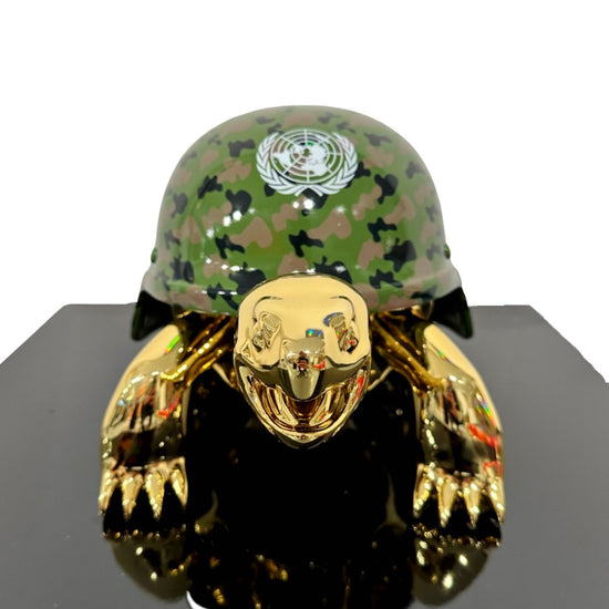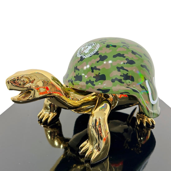 Van Apple created the Peace Turtles on his own artistic way. He gave the turtles a helmet instead of their shell, to show his love and respect for these protected species. The turtles are created in gold to express their value and are given a colorful and contemporary helmet, each design makes a statement. Not UV resistant.