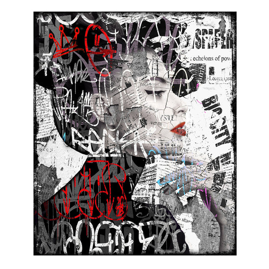 His signature series Faces are printed and edited on leather. The artwork is set on an aluminum dibond plate and provided with a sleek aluminum frame.