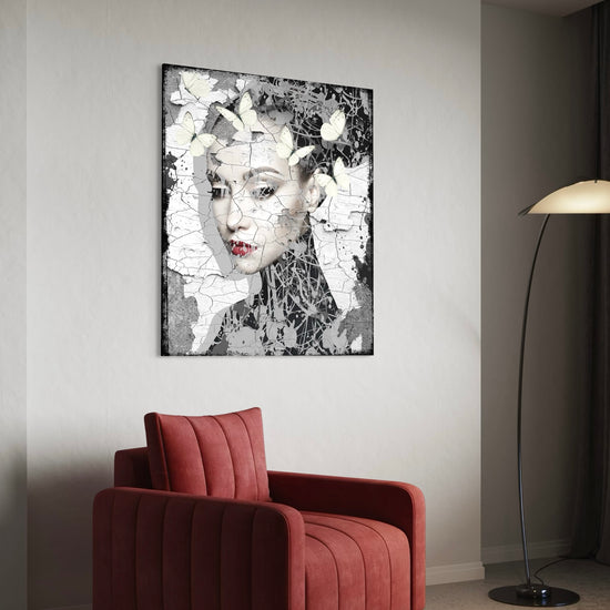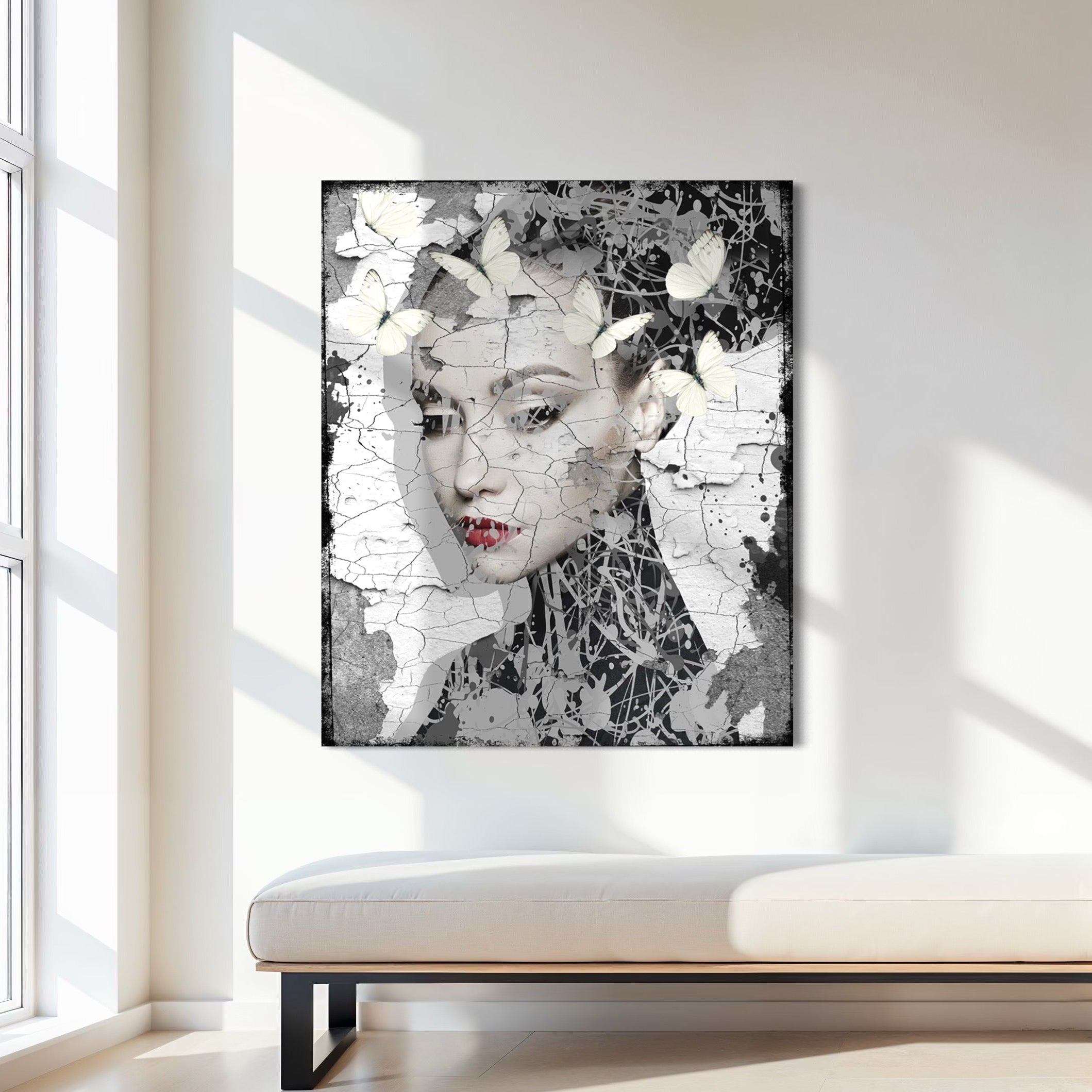 His signature series Faces are printed and edited on leather. The artwork is set on an aluminum dibond plate and provided with a sleek aluminum frame.