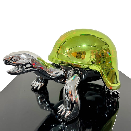 Van Apple created the Peace Turtles on his own artistic way. He gave the turtles a helmet instead of their shell, to show his love and respect for these protected species. The turtles are given a colorful and contemporary helmet, each design makes a statement.